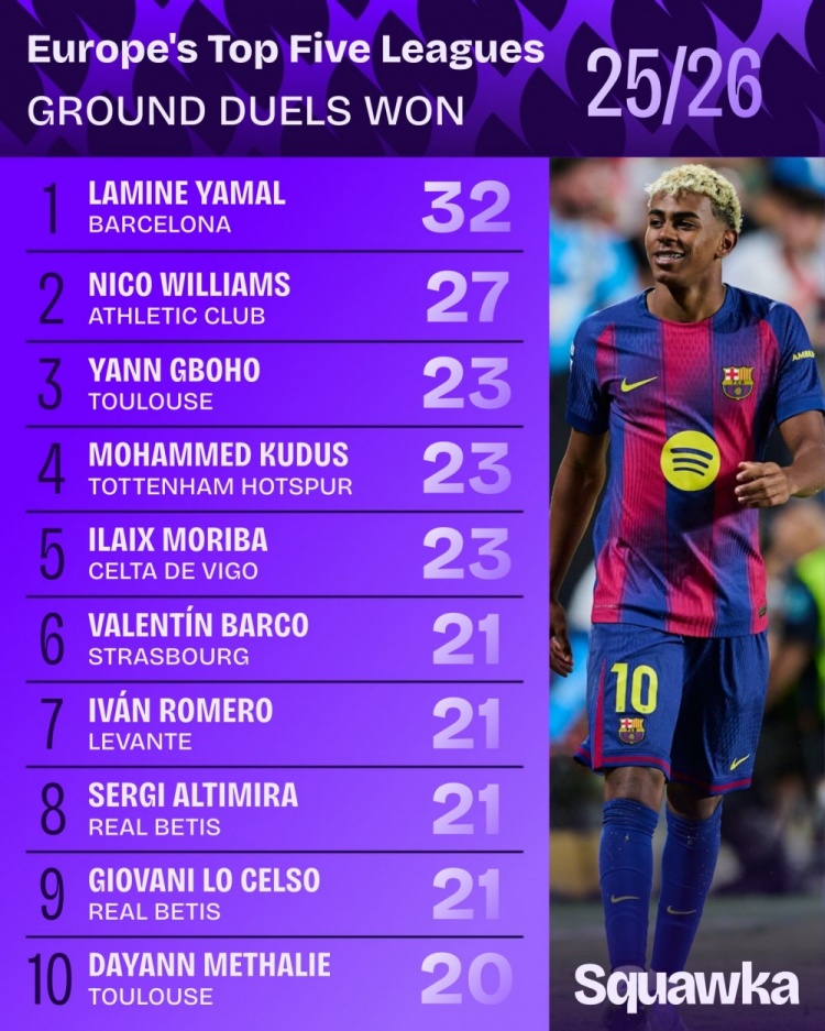 开云体育官网-本赛季五大联赛地面对抗成功榜:亚马尔32次居首,尼科27次第二
