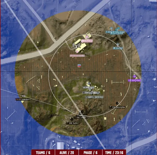 决赛圈四支队伍。PeRo开车向圈内转移,但转移过程中被多队枪线打掉两人,随后4AM利用道具将PeRo最后两人淘汰。