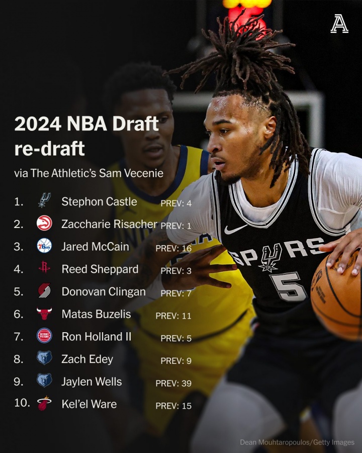8月15日最新消息,知名体育媒体TA的资深记者Sam Vecenie对2024届新秀进行了重新评估,最新出炉的前十顺位排名如下: