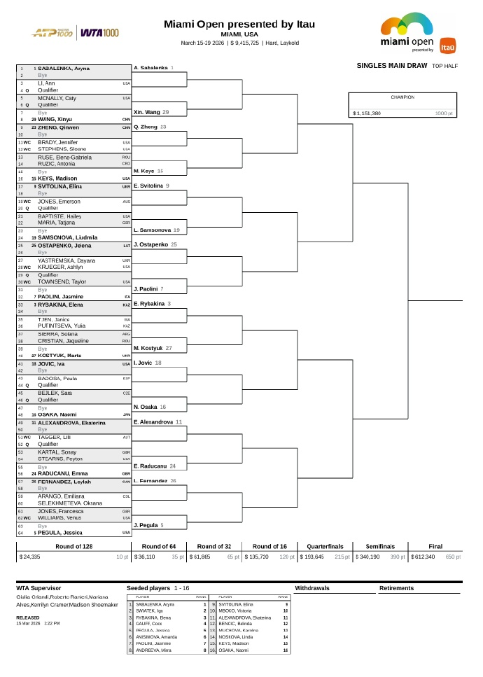 23号种子郑钦文,与萨巴伦卡同在1/8区;这也意味着如果两人都跻身16强后就将再次相遇。