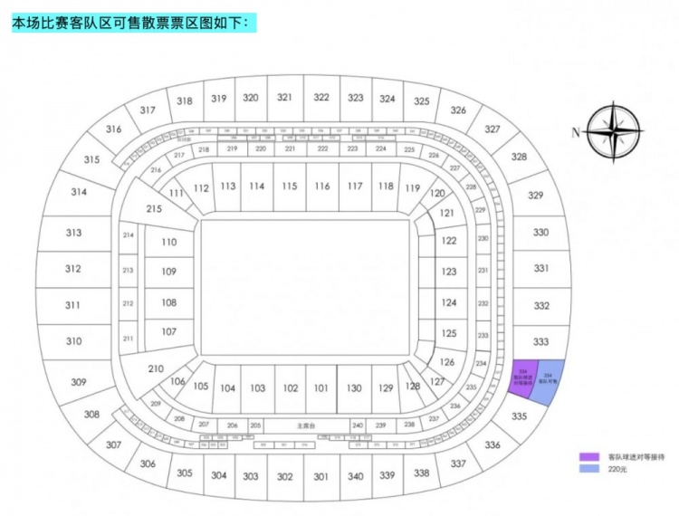 本场比赛客队区可售散票票区为334区,均为220元档位。